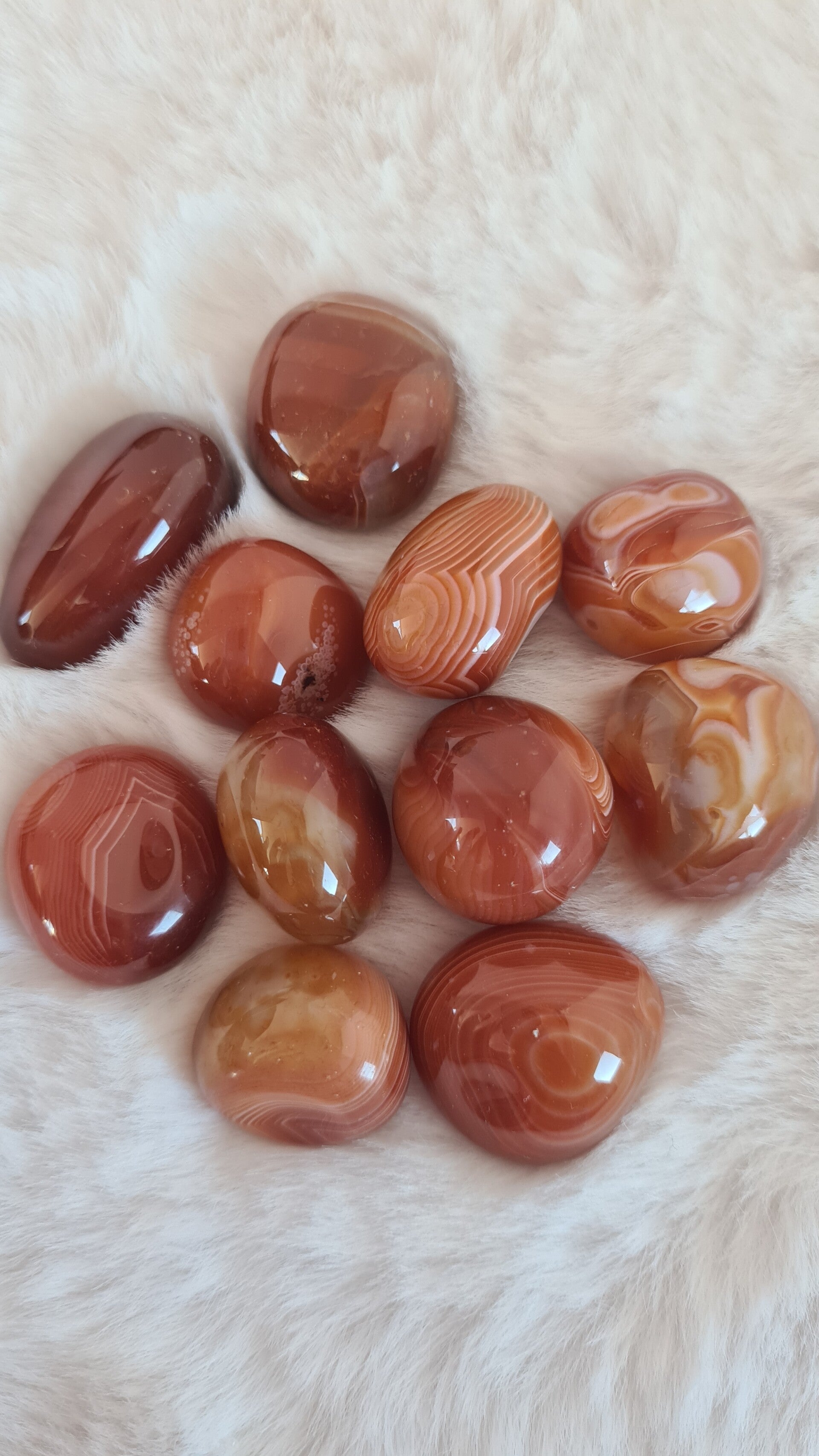 Carneool geeft kracht, energie, moed en doorzettingsvermogen. Het werkt activerend en motiverend en stimuleert creativiteit. Het vergroot zelfvertrouwen en gevoel van eigenwaarde